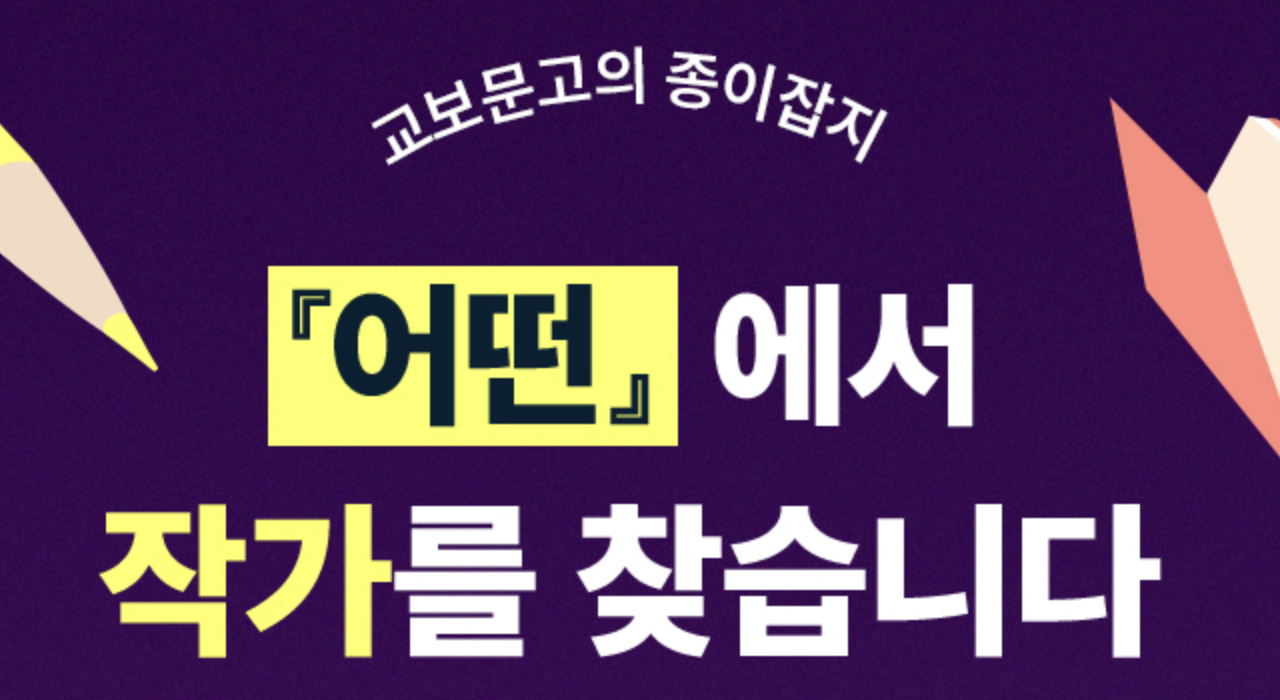 읽기 뿐만 아니라 쓰는 데도 관심이 있다면! 저는 종종 여러 문고 사이트를 돌아다니며 어떤 색다른 이벤트가 있을지, 단독 판매하는 혹하는 도서는 없는지 등을 찾아보는데요. 이번에 교보문고에서 흥미로운 행사를 진행하더라고요. 교보문고에서 독자와 함께 만들어 가는 종이 잡지 <어떤>에 글을 실을 작가를 찾고 있어요. 지금 공모 받고 있는 주제는 '사이' 인데요. 300-1000자 사이의 분량으로 자유롭고 참가상 100인에게는 교보문고 e교환권 5천원권도 드린다고 하니 가벼운 마음으로 한번 써보시는 건 어떨까요?